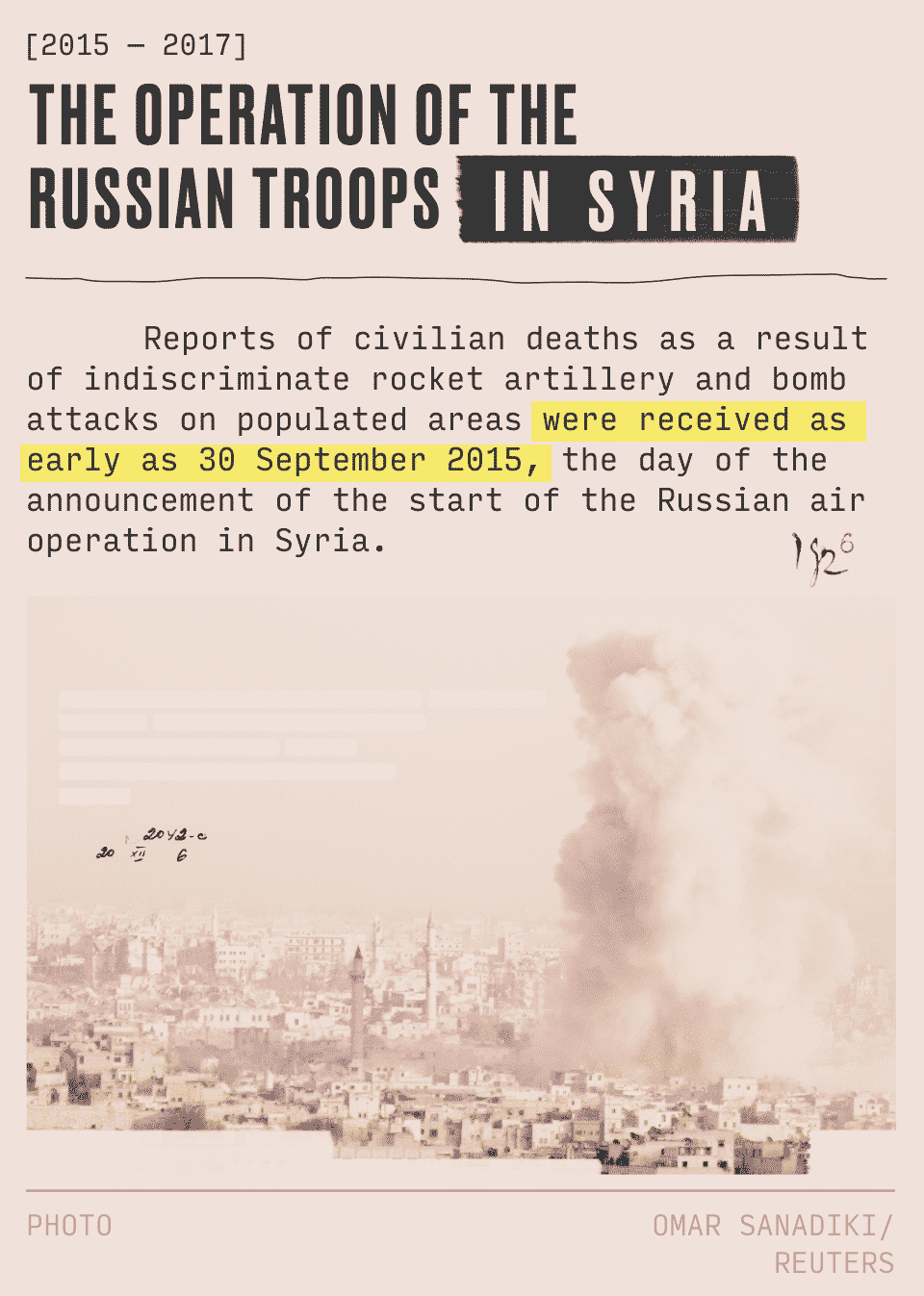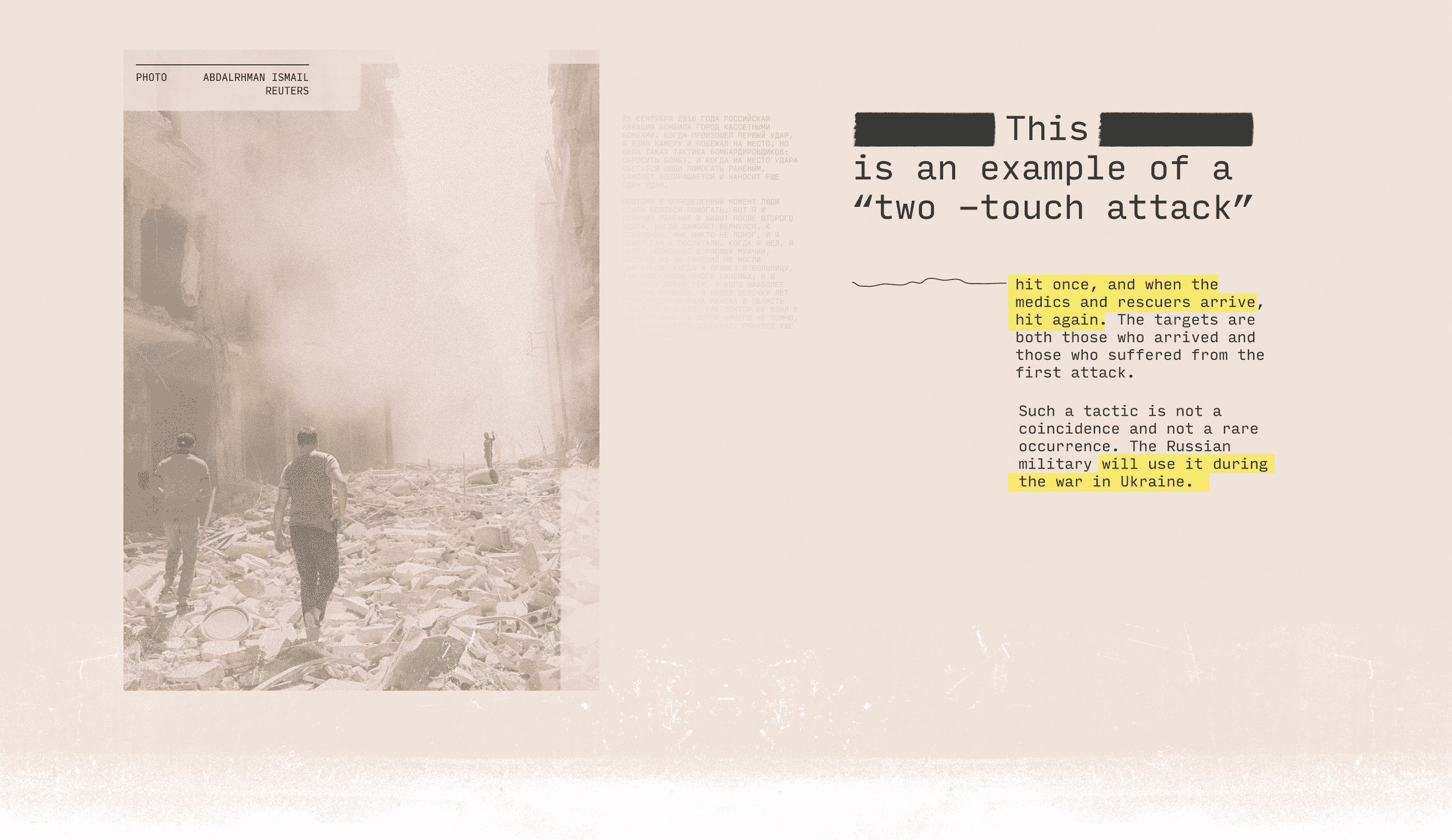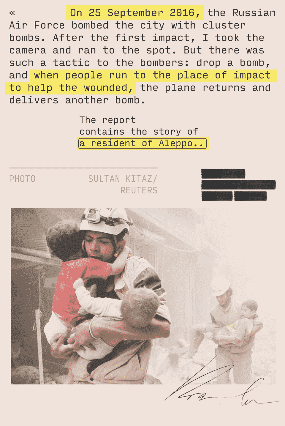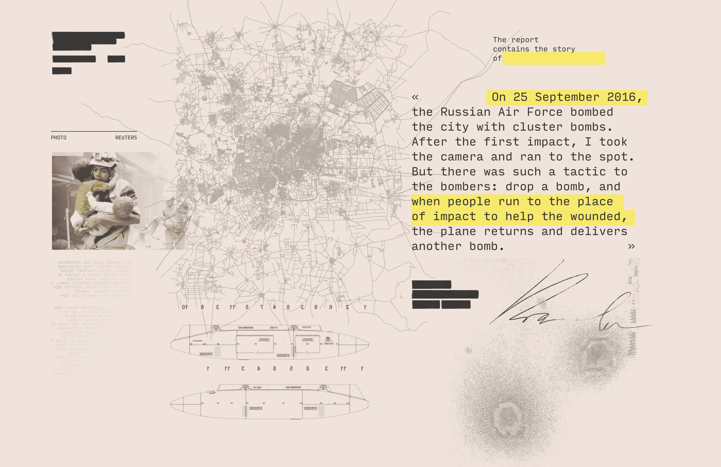 On September 25, 2016, Russian aircraft bombed the city with cluster bombs. When the first blow occurred, I took the camera and ran to the place. But there was such a tactic of the bombers: to drop a bomb, and when people run to the place of impact to help the wounded, the plane returns and strikes again.