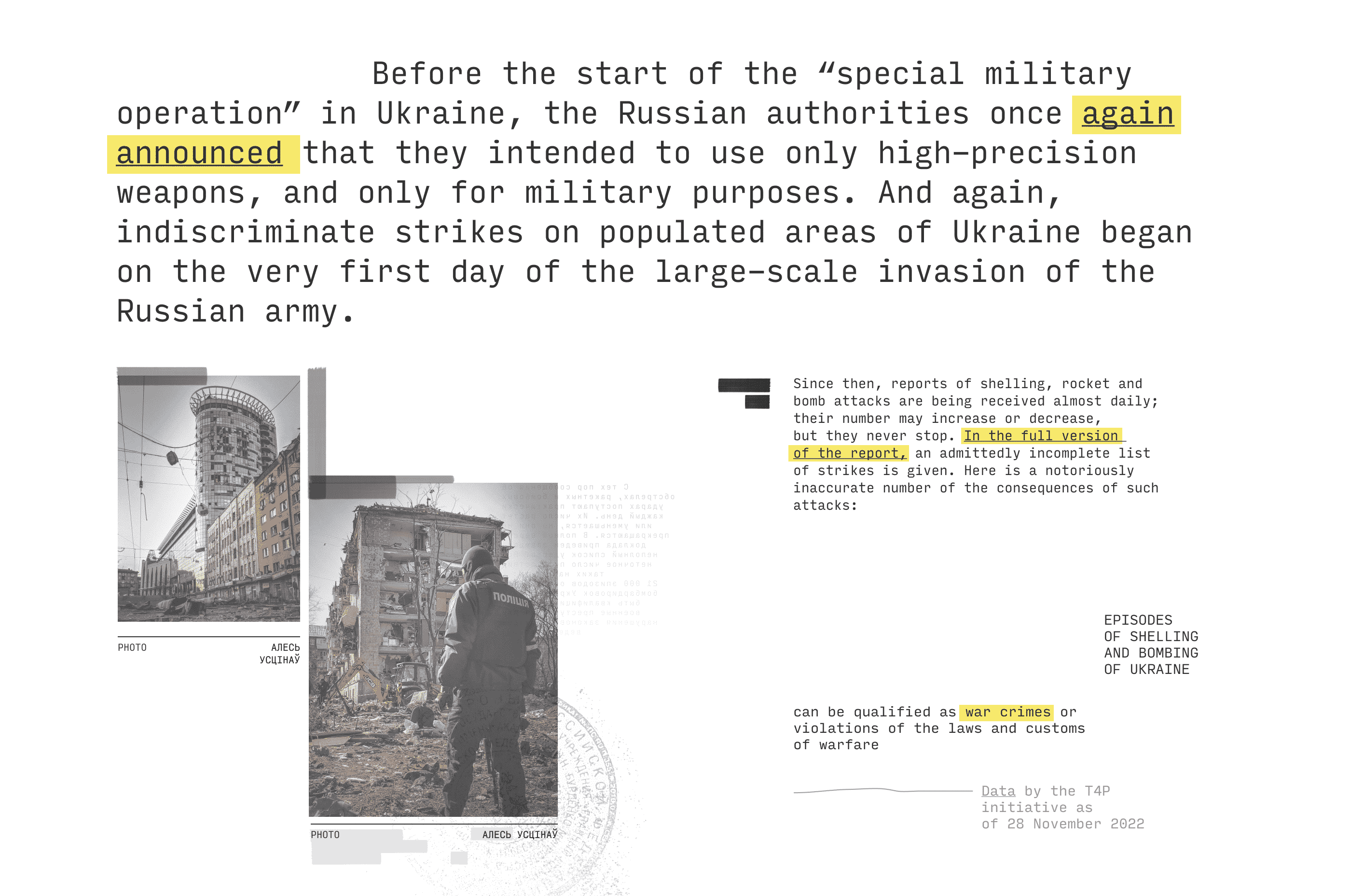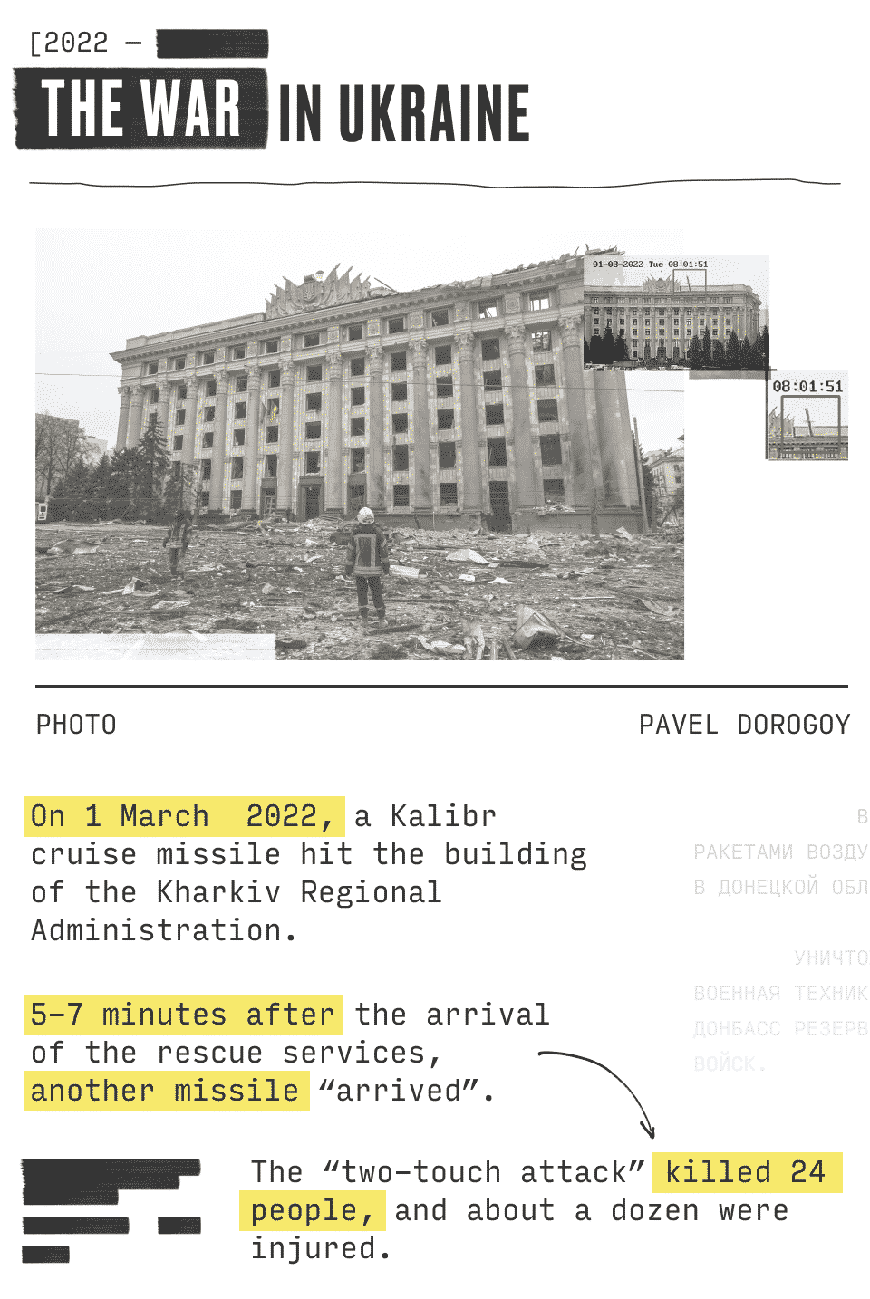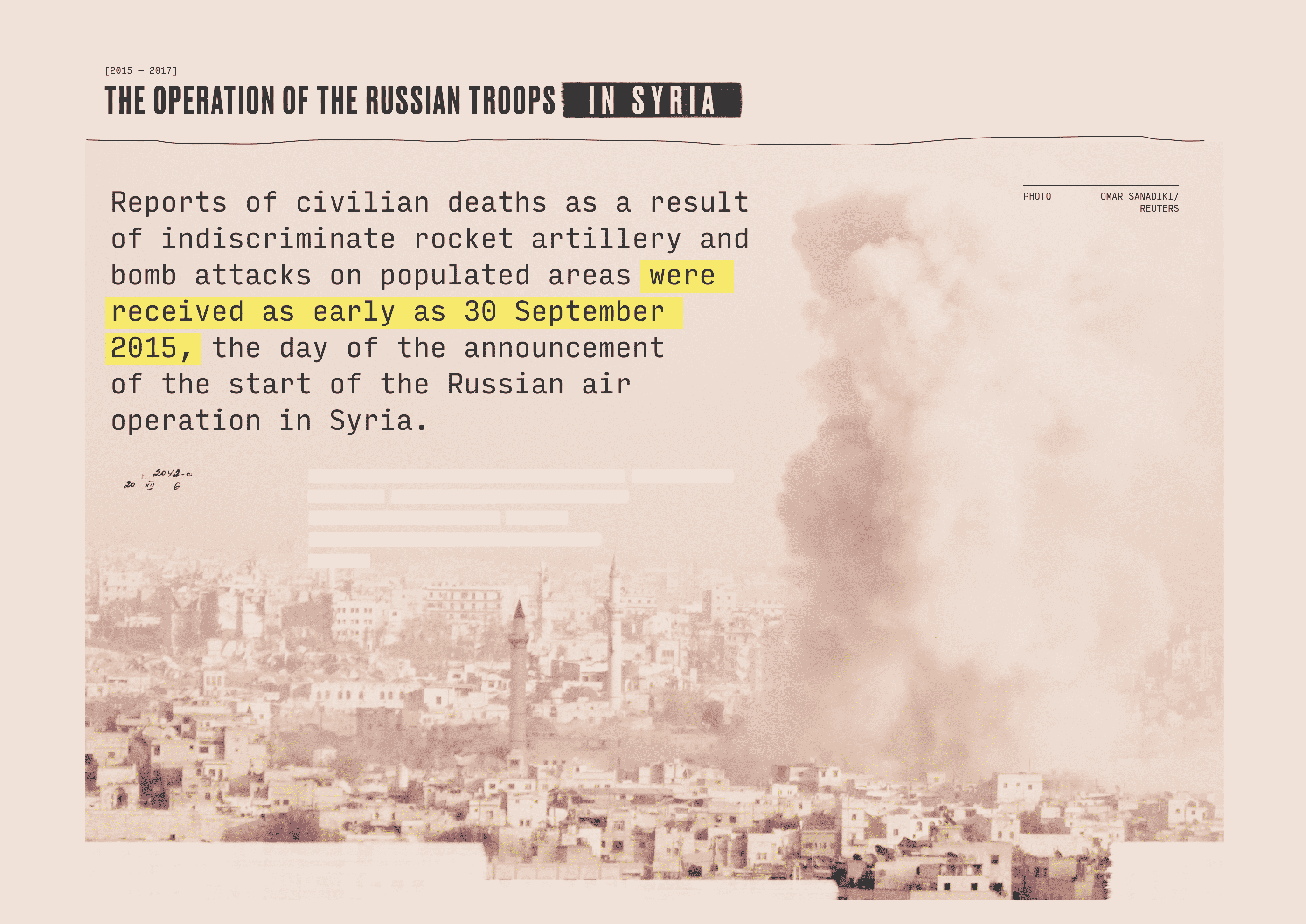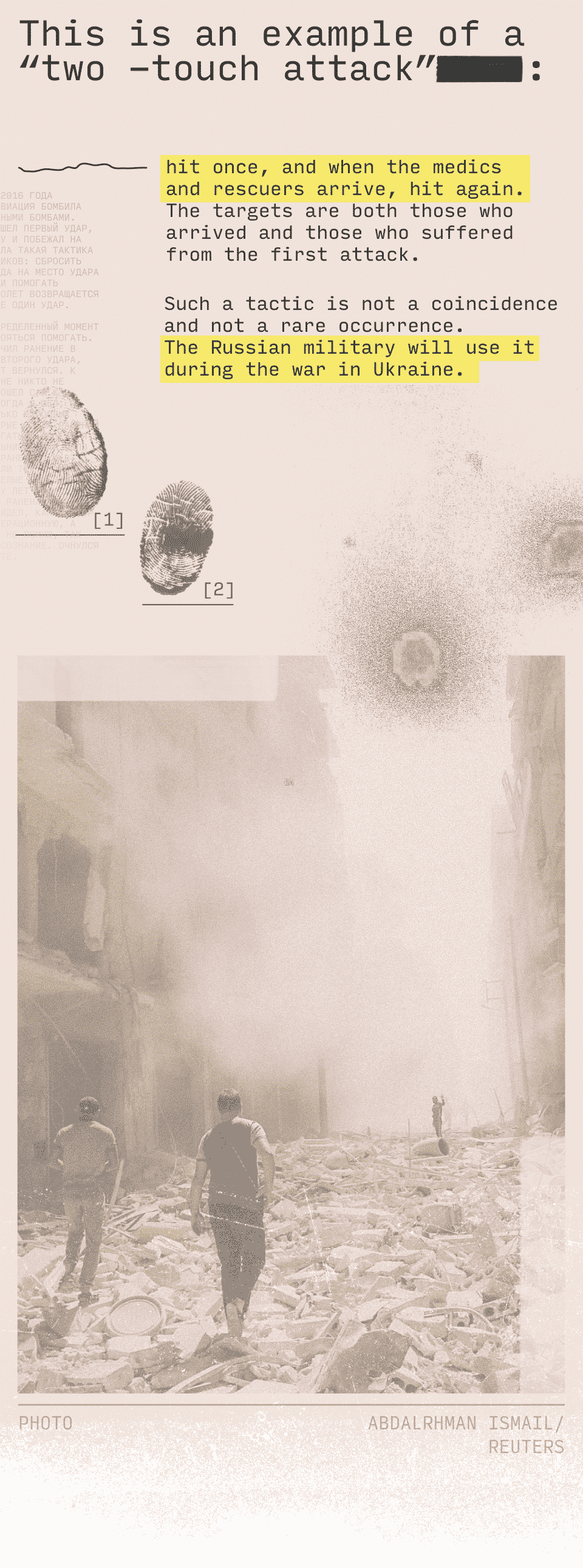 On September 25, 2016, Russian aircraft bombed the city with cluster bombs. When the first blow occurred, I took the camera and ran to the place. But there was such a tactic of the bombers: to drop a bomb, and when people run to the place of impact to help the wounded, the plane returns and strikes again.