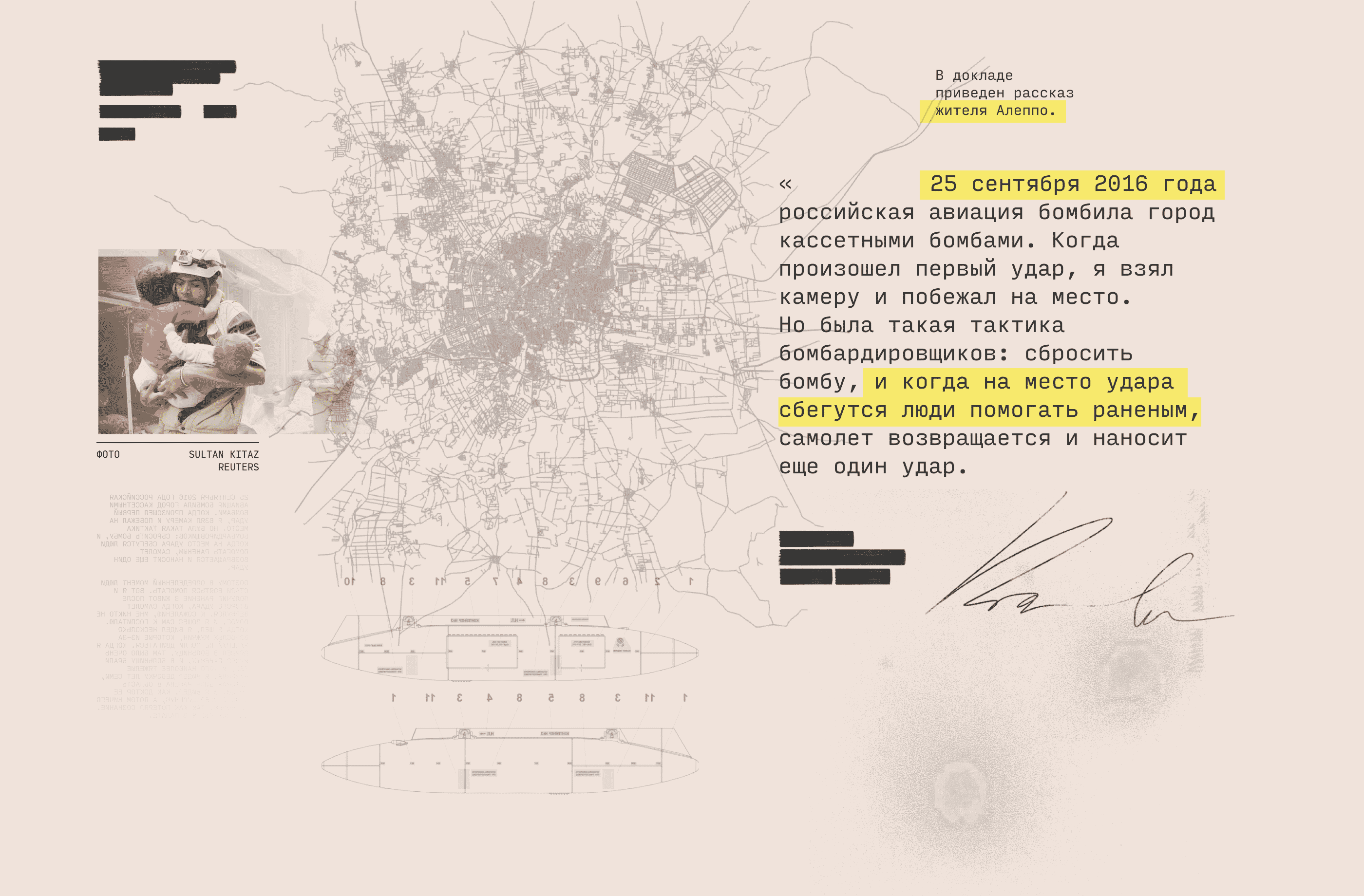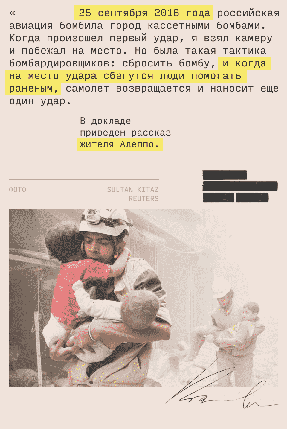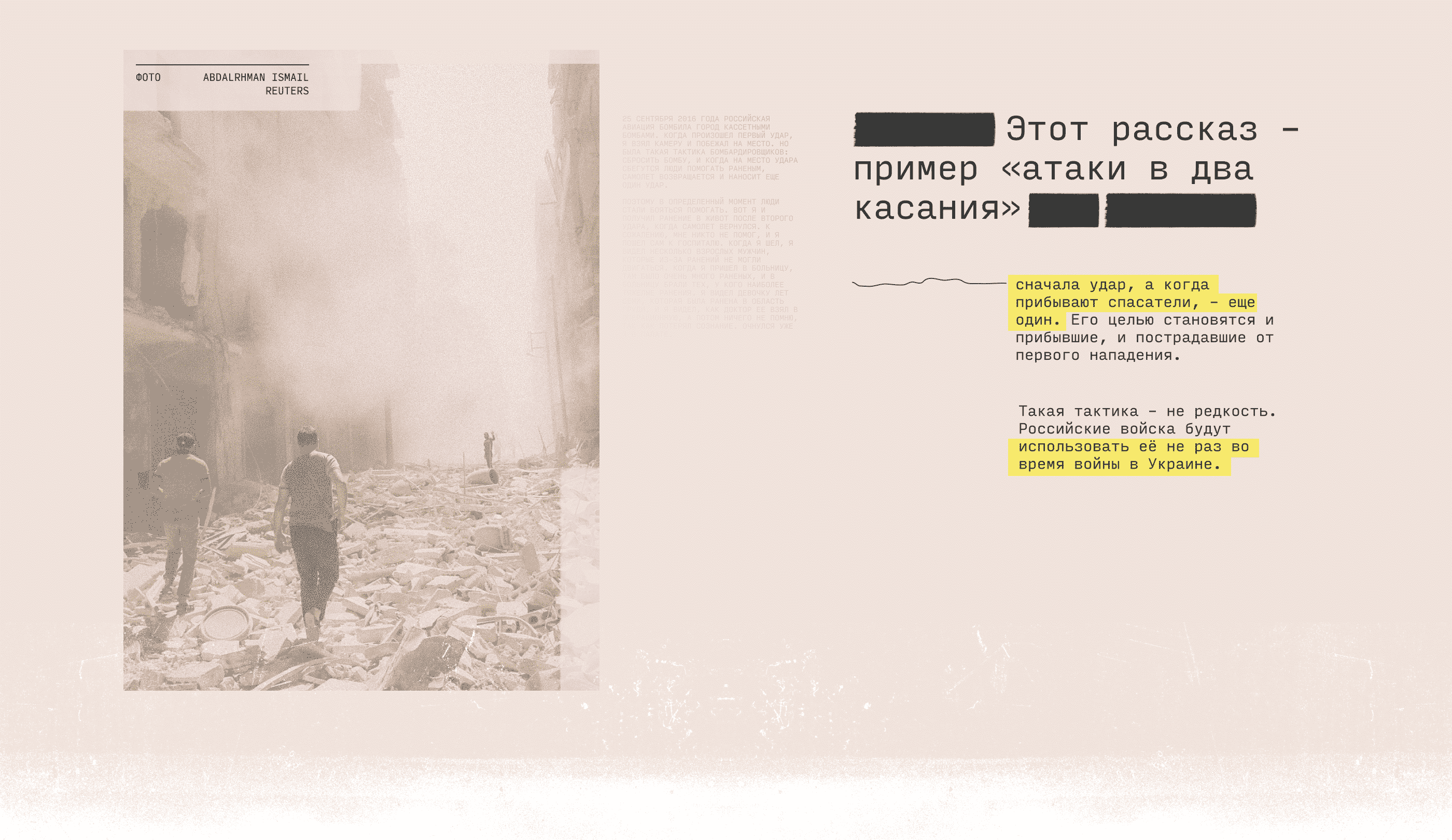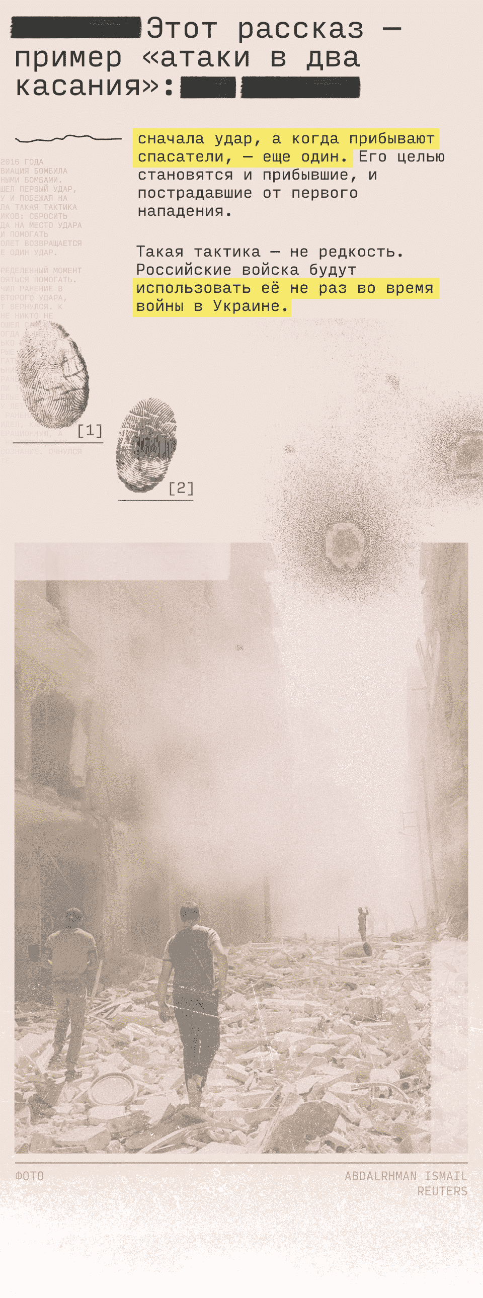 25 сентября 2016 года российская авиация бомбила город кассетными бомбами. Когда произошел первый удар, я взял камеру и побежал на место. Но была такая тактика бомбардировщиков: сбросить бомбу, и когда на место удара сбегутся люди помогать раненым, самолет возвращается и наносит еще один удар.