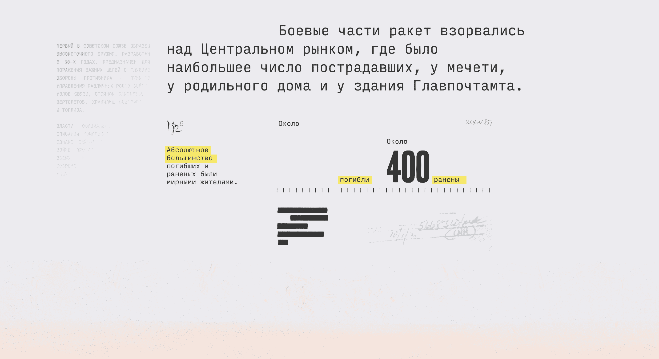 Поэтому в определенный момент люди стали бояться помогать. Вот я и получил ранение в живот после второго удара, когда самолет вернулся. К сожалению, мне никто не помог, и я пошел сам к госпиталю. Когда я шел, я видел несколько взрослых мужчин, которые из-за ранений не могли двигаться. Когда я пришел в больницу, там было очень много раненых, и в больницу брали тех, у кого наиболее тяжелые ранения. Я видел девочку лет семи, которая была ранена в область груди, и я видел, как доктор ее взял в операционную, а потом ничего не помню, так как потерял сознание. Очнулся уже я в палате.