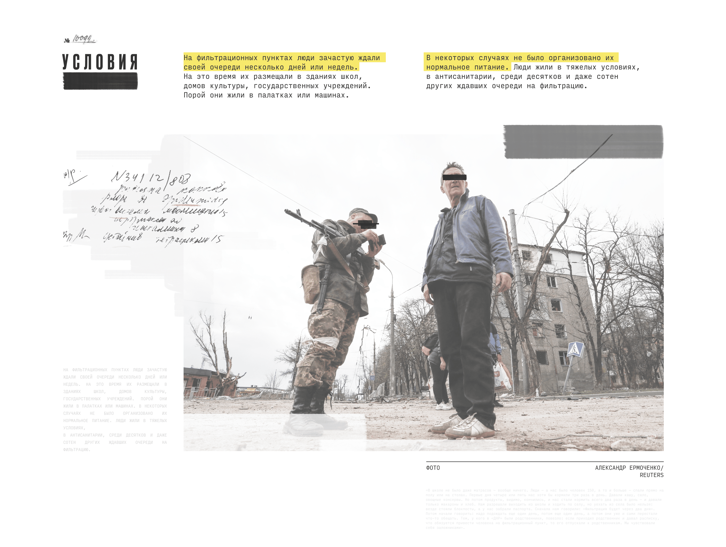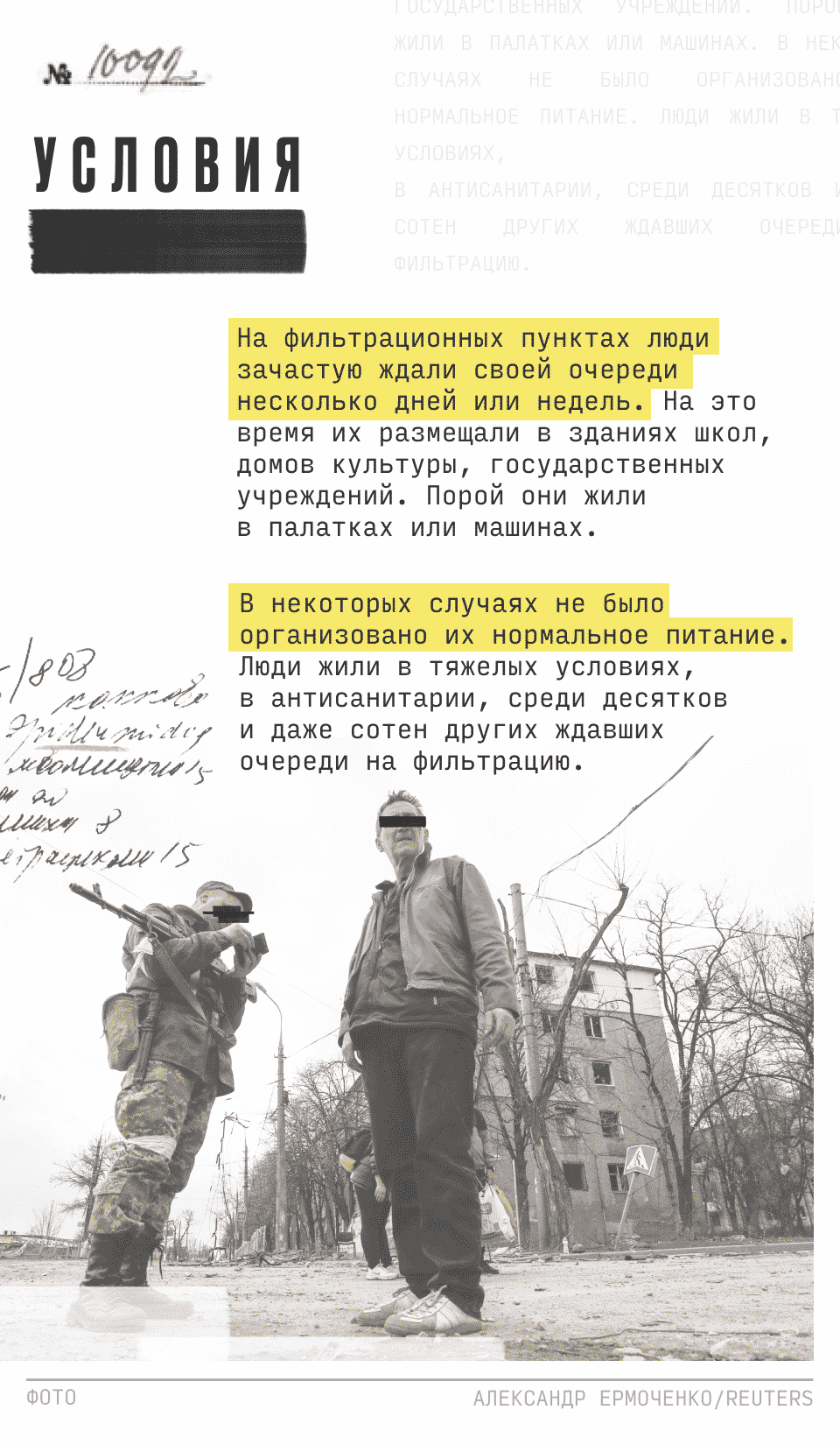 «ㅤㅤㅤㅤㅤВ школе не было даже матрасов — вообще ничего. Люди — а нас было человек 150, а то и больше — спали прямо на полу или на столах. Первые дня четыре или пять нас хотя бы кормили три раза в день. Давали кашу, сало, овощные консервы.